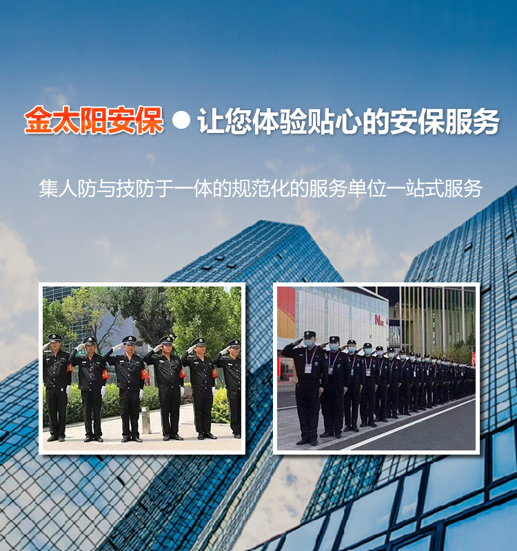 我们是经严格审核通过后注册成立的一家安保服务公司,同时集人防与技防于一体的规范化的服务单位,公司现有员工500多人,服务的项目30多个(工厂门卫、高等级别墅、大型商场、写字楼、学校等)另外保洁服务、绿化养护,服务范围(江苏、浙江、安徽等地)公司成立以来、始终以“诚信为本、客户至上、服务至上”为宗旨,为企业保驾护航、做企业的安全守护神。